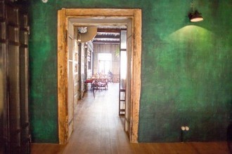 Помещение паба не отличается вычурным интерьером. Всё довольно просто: кирпичная кладка, деревянные столы и стулья, живые растения под потолком. Разбавляет эту простоту красочный ковёр с изображением оленя и стена выкрашенная в зеленый цвет.